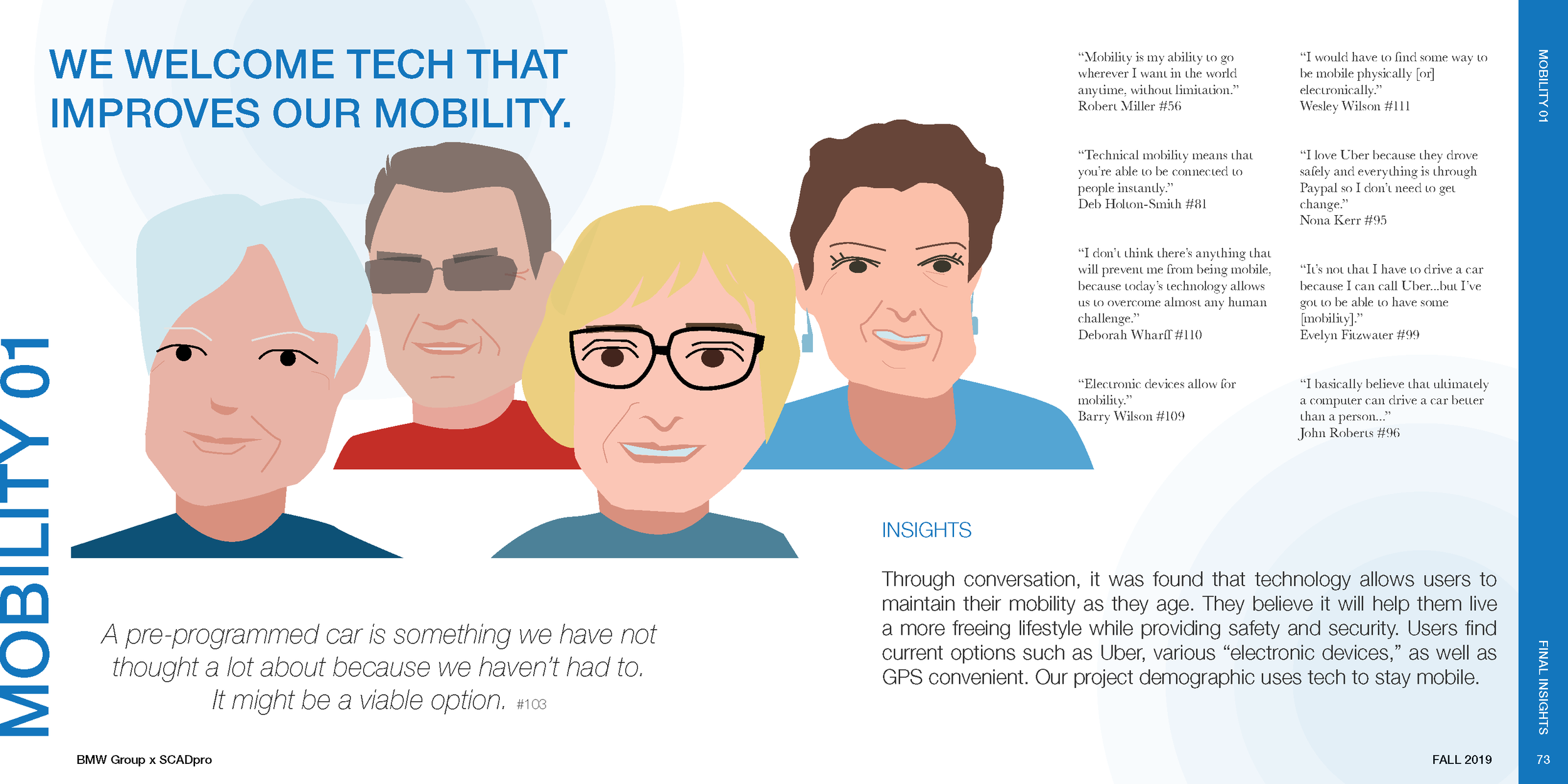 The goal of this collaboration was to gather primary research data and understand trends and habits in mobility, technology, and life throughout the aging demographic while also digging deeper to uncover their motivations, needs, and what truly influences their decisions.