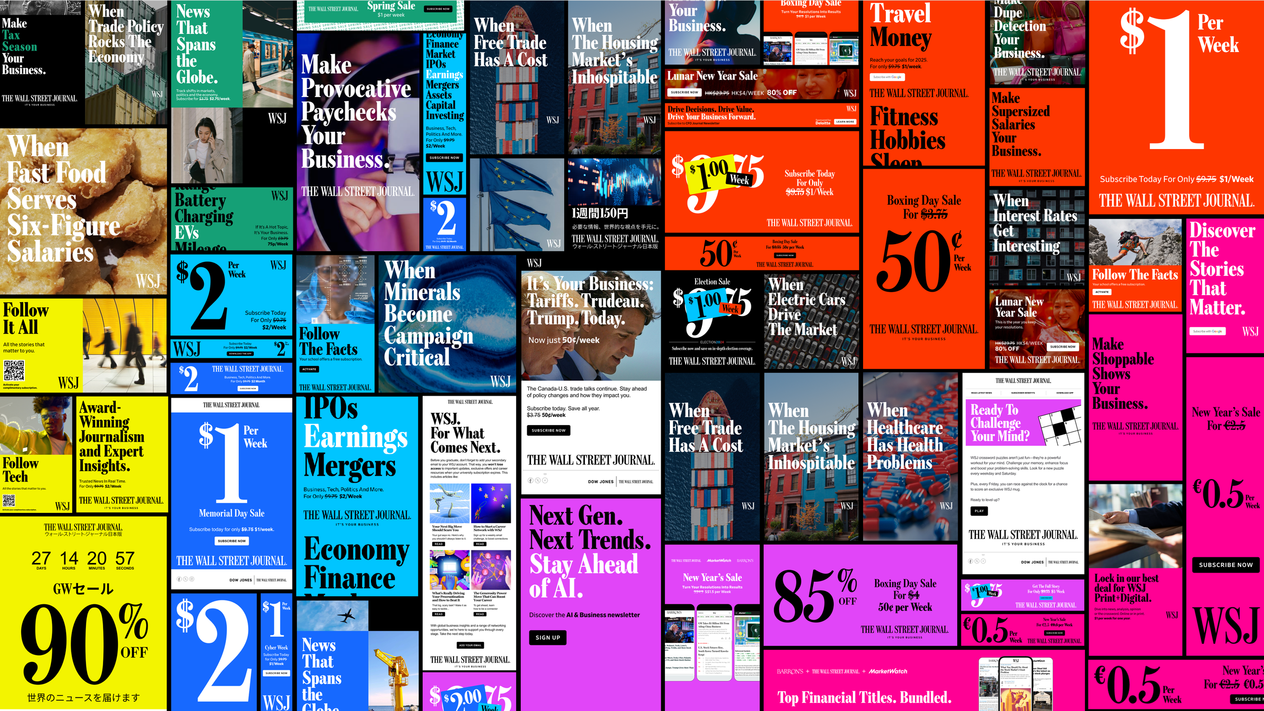 I lead the creation of the WSJ design system in Figma, which was developed to enable our team to easily access all of the essential elements of the WSJ brand in a single, centralized location. Prior to this, WSJ’s design elements were either documented in written guidelines or constructed within Adobe applications, neither of which offered the efficiency or flexibility needed when projects were briefed in on a daily basis. This new system significantly improved our workflow and consistency across all design work.